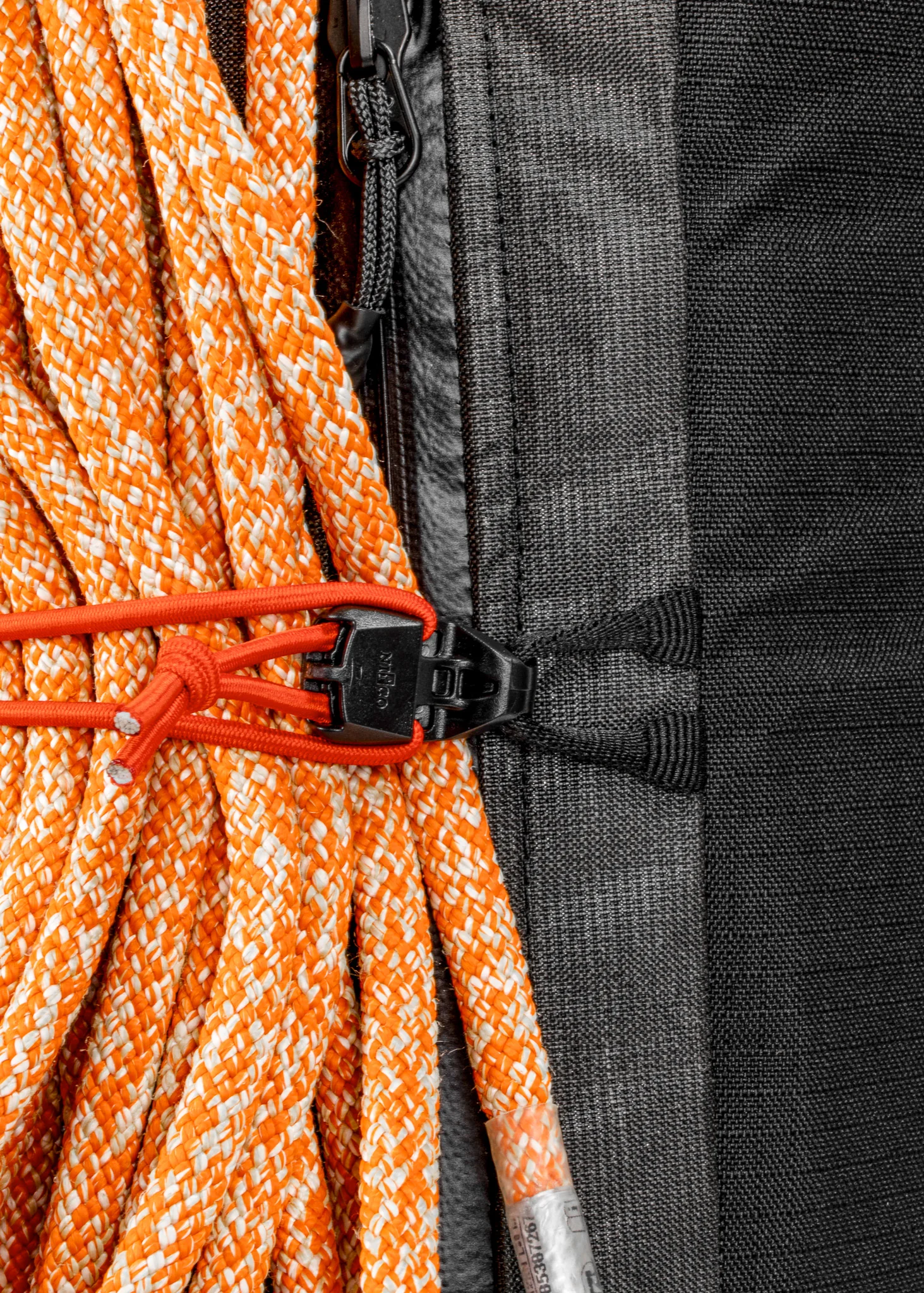 - Odnímateľné prílslušenstvo - slučky na cepín s klipmi, horný popruh, bedrový pás a penový zadný panel sú odnímateľné pre zníženie hmotnosti alebo ich možno vymeniť v prípade poškodenia