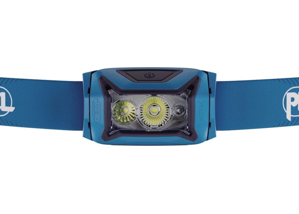Výkonná, jednoduchá čelovka Petzl Actik 450 blue s červeným svetlom, ideálna pre dynamické outdoorové športy.