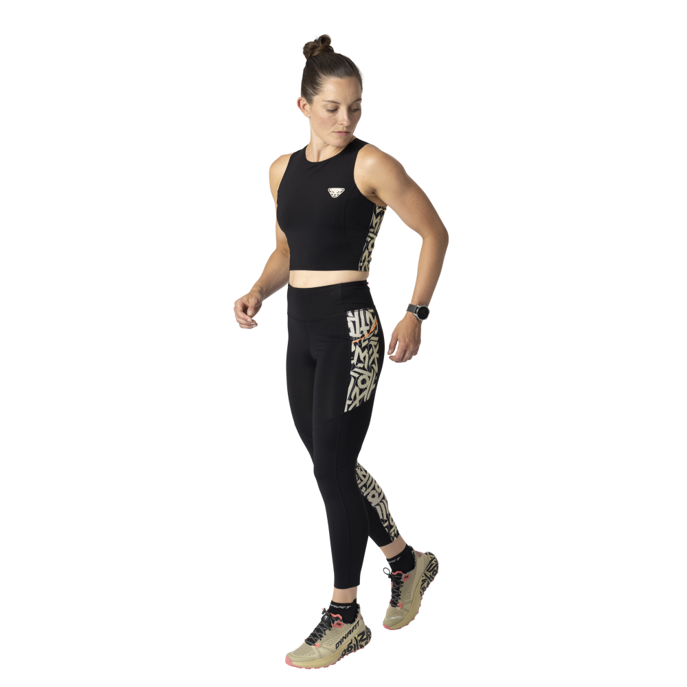 Pohodlné a štýlové legíny Dynafit Trail 7/8 Tights black out 7/8 dĺžky s grafickou potlačou a praktickými bočnými vreckami.