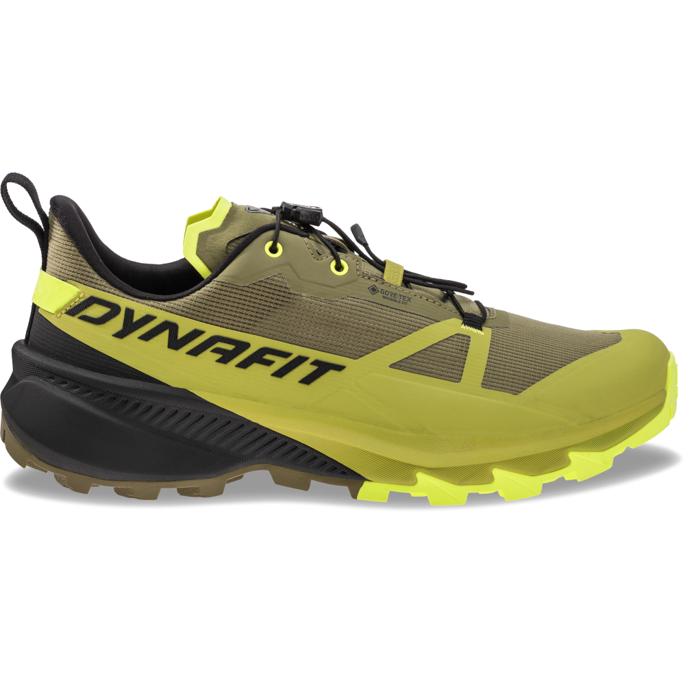 Univerzálna pánska nepremokavá obuv Dynafit Traverse 2 GTX golden lime/military green, navrhnutá na kombináciu trailového behu a ľahkého lezenia, s dôrazom na stabilitu, kontrolu a vysokú úroveň trakcie.