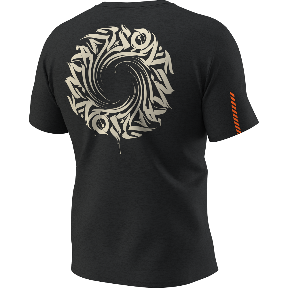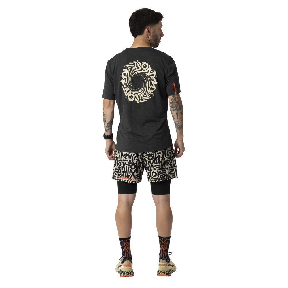 Vysoko výkonné trailové bežecké tričko Dynafit Trail T-Shirt black out, ktoré kombinuje recyklovaný materiál s pútavým grafickým dizajnom na chrbte.